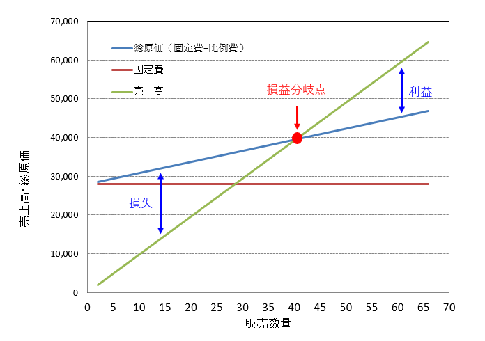 総原価線と売上高線が交差する点が、損益分岐点となります。損益分岐点よりも多く販売することができれば利益となりますが、損益分岐点よりも販売数量が少ないと損失が発生します。
