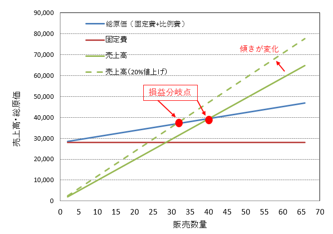 販売価格を値上げした場合、売上高の直線は図のように左上にシフトします。このため、より少ない数量で利益を上げることができます。