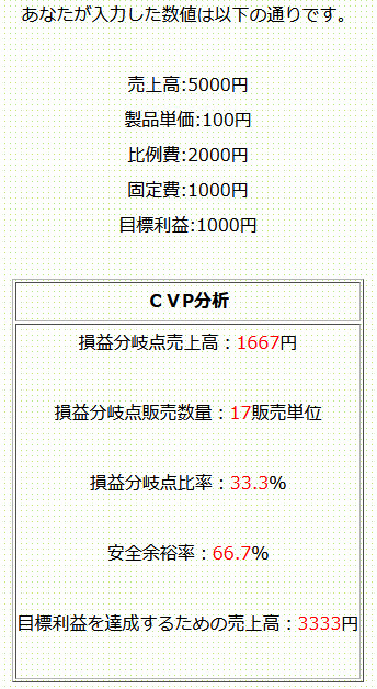 売上高、製品単価、比例費、固定費、目標利益を入力すると、以下の情報を計算することができます。