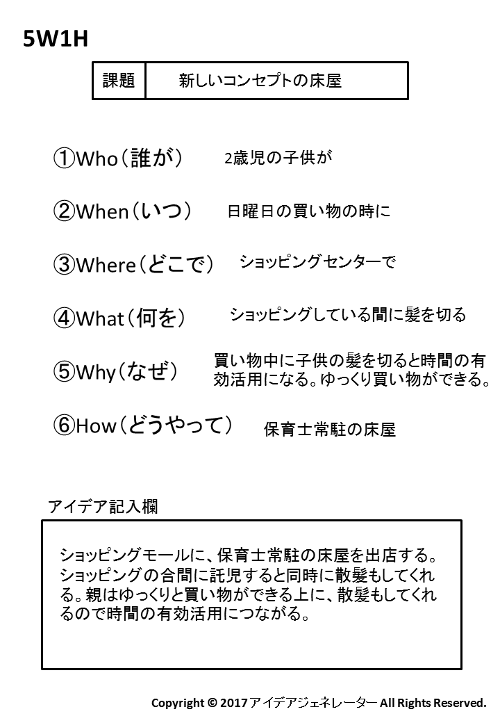 5W1Hで考えることで、「ショッピングモールに保育士常駐の床屋を出店する」というアイデアを発想しました。