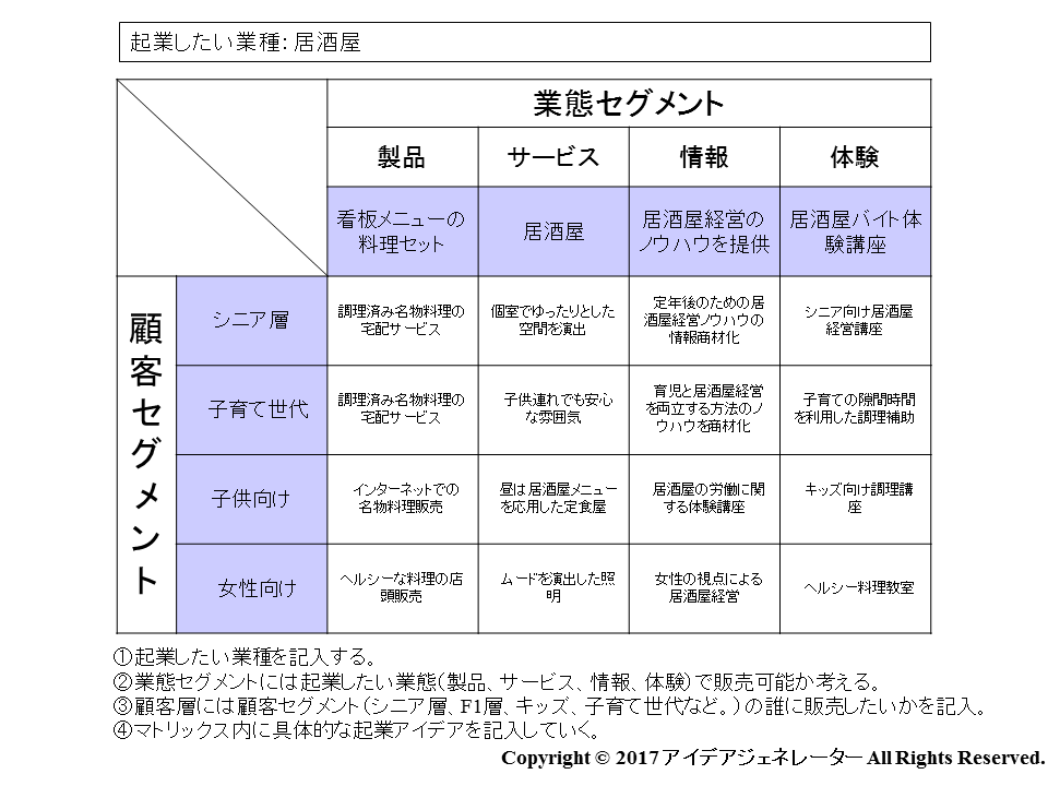 - 業態セグメントには、起業したい業種の業態を記入していきます。例えば、あなたが居酒屋でバイトしていたとします。当然、居酒屋を経営することも、起業方法の1つです。一方でバイトでの経験を活かして居酒屋経営ノウハウを情報商材として販売することも、立派なビジネスになるかもしれません。また看板メニューがあれば、そのメニューを自宅で味わうことができる料理セットを販売できるかもしれません。このように、居酒屋でバイトしたという1つの経験から、異なる業態でビジネスを始めることも重要な起業アイデアの発想と言えます。